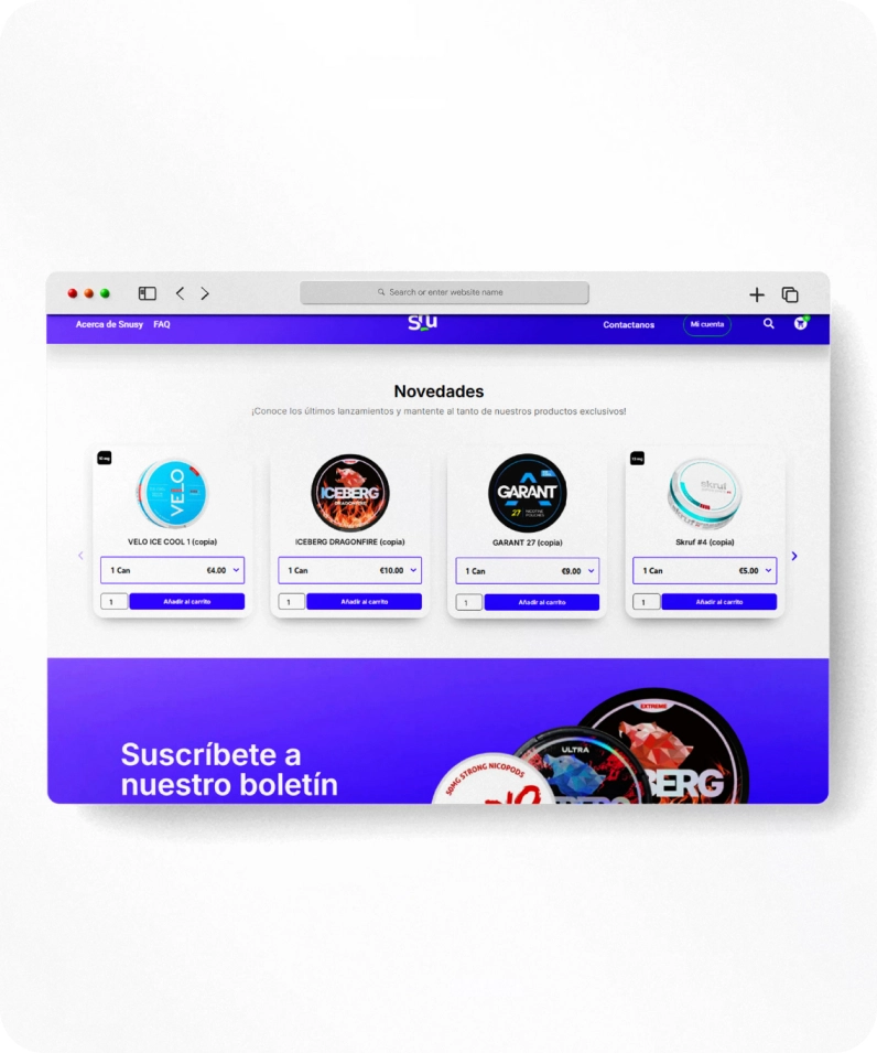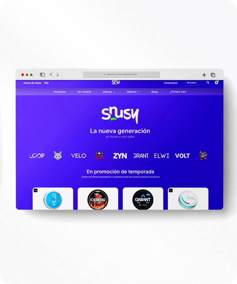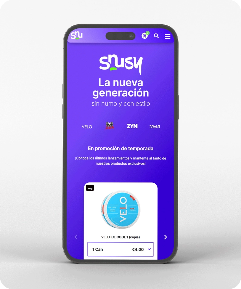 En Taranis Galicia S.L., llevamos a cabo una tienda en línea para comercialización de nicotine pouches, desarrollado a medida en Wordpres Woocommerce con un diseño a medida. Nuestro objetivo fue garantizar no solo la calidad, sino también una experiencia de usuario excepcional. Respetamos la identidad de la marca, manteniendo sus colores y tipografía, lo que resulta en un diseño funcional y atractivo. Cada elemento está cuidadosamente con el fin de impulsar la marca y conectar emocionalmente con los usuarios, creando una plataforma que refleja la identidad de Snusy.